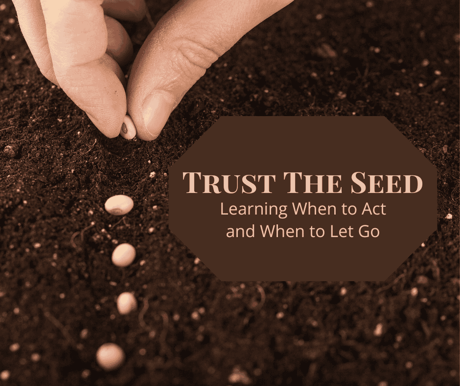 My businesses are the perfect example: I’d work like a beast to set everything up, do all the right things, and talk to all the right people. I’d push and push and push … then push some more. Then I’d pivot, or quit – from exhaustion usually – before the success. I now understand that I wasn’t trusting the seeds I planted. I wasn’t giving them the space, time, or gentle attention that seeds need to germinate, grow and bear fruit.